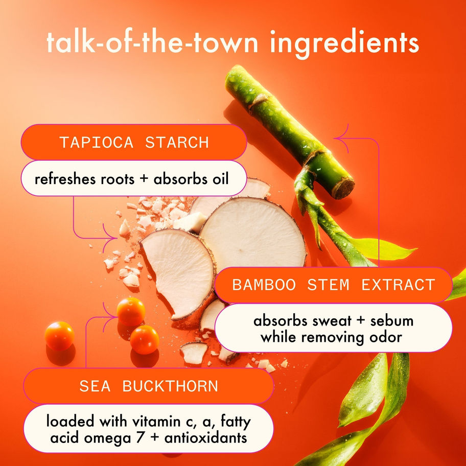 - revitalizes greasy strands courtesy of root-friendly ingredients like oil-absorbing tapioca starch, odor-removing bamboo stem extract + our signature superfruit sea buckthorn.